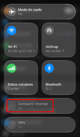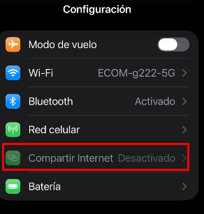 Sal de la aplicacion de Configuracion abriendo cualquier otra, WhatsApp, TikTok, etc, y luego habilita y deshabilita el modo avion. Vuelve a abrir la app de Configuracion, la opcion de Compartir Internet estara habilitada: