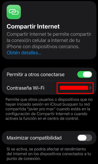 Selecciona Compartir Internet y establece una contrasena para proteger el punto de acceso, Contrasena Wifi: